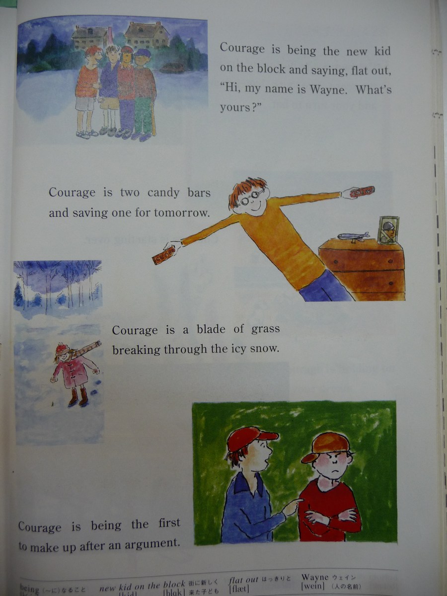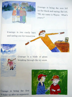 What the hell is this? The last thing that the poor 3rd graders learn in the year is an edited version of some awful American story called Courage. It features quips like, "Courage is a blade of grass breaking through the icy snow," but also takes a moment to relate to the youngsters with, "Courage is the bottom of the ninth, tie score, two outs, bases loaded, and your turn to bat." Whatever the bloody hell that means.