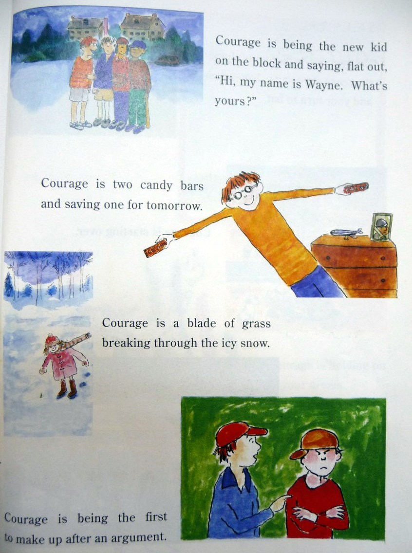 The single most stupid, however, has to be, "Courage is being the new kid on the block and saying, flat out, 'Hi, my name is Wayne. What's yours?'" Not just because the vocab is much too difficult, but if some kid was called Wayne he'd know better than to tell anyone, lest he find out that their name was Punch In The Face Hurr Hurr You Spazzy Bell-End.