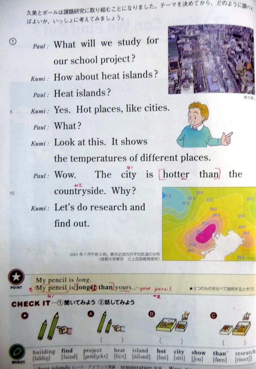 The pair have been set an assignment at school, and jack-in-the-box glory-hunter Kumi suggests that she and Paul study the phenomenon of "heat islands" together. They get off to a bad start when total retard Paul can't figure out why cities are hotter than the countryside, but when in part two the Internet is introduced, we see our American hero nearly swoon in delight. Parts three and four build to the dizzying crescendo of throwing a load of soil and plants on your roof to make it cooler, all the while teaching such marvels as "My bag is as big as your bag" and "Soccer is the most popular of the three" to an enthralled class.