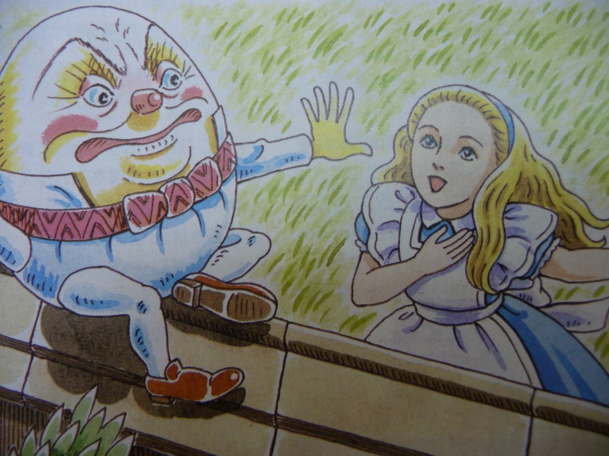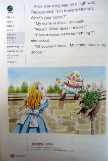 Then we're treated to a curious retelling of Alice in Wonderland featuring Humpty Dumpty (end of New Crown 1). I love Humpty Dumpty, and imagine my delight at learning more about his back-story - it turns out his name means his shape! Thanks Japan!