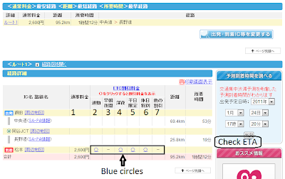 The ルート1 section at the top will display multiple routes if available. The price quote (column 1) is the regular cost, and the blue circles are the various options when using an ETC card. See future posts on the dramas of aquiring one.