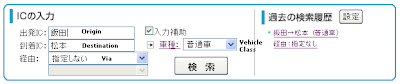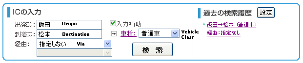 Secondly, and most easily, you can use the origin and destination input boxes on the front page of the Japanese site. You have to use kanji for this. Check wikipedia for your chosen cities to find out the characters if you don't know them. The next page will ask for a confirmation of which exit you want if you haven't already stipulated.