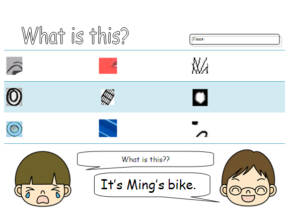 The idea is pretty self explanatory. Give each pair of students one copy of the sheet with the full images (or one each if you want), and one copy each of the answer sheet. Students have to work out what the snippet represents and write the sentence in the box. The lines around different objects dictate their owner, so the first snippet would be "It is Paul's dog." Of course, you can change it to "This is Paul's dog" if that's what you've been asked to do. Both are covered consecutively in my textbook.