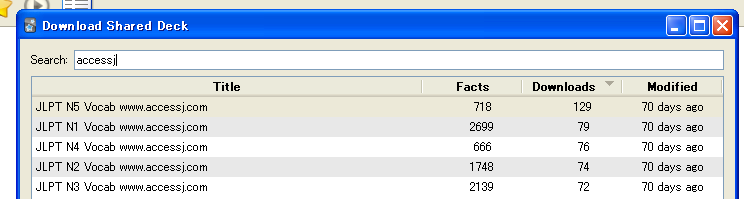 - Use the keyword "accessj" or "JLPT N(your level)" and you will find our decks. Click download.