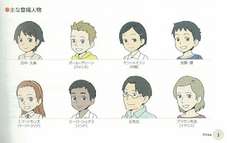 We already beat this into the ground in a few articles last year, but New Crown is all about global awareness: "Save the 1) dolphins, 2) rainforest, 3) ecology, 4) disappearing indigenous cultures of the world." Pick one. New Crown's probably got it covered, and it's got a cast of characters to match, special care taken to represent emerging super-economies India and China. Note also the spacing of the characters here. They don't put the Japanese characters and the white characters together, like New Horizon above. No, New Crown is a literal melting pot of fertile young minds.