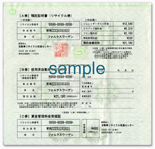 The official proof of payment for auto recycling fees is your recycling voucher (risaikuru-ken リサイクル券). This is a very important piece of paper so you should keep it with you at all times, preferably tucked away along with your inspection certificate (jidoshaken-sho 自動車検査証) and insurance certificates.